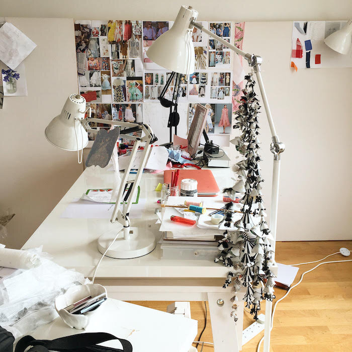 Francesca’s first studio in Notting Hill where you can see boards of inspiration images, samples, fabric cuts and paint.